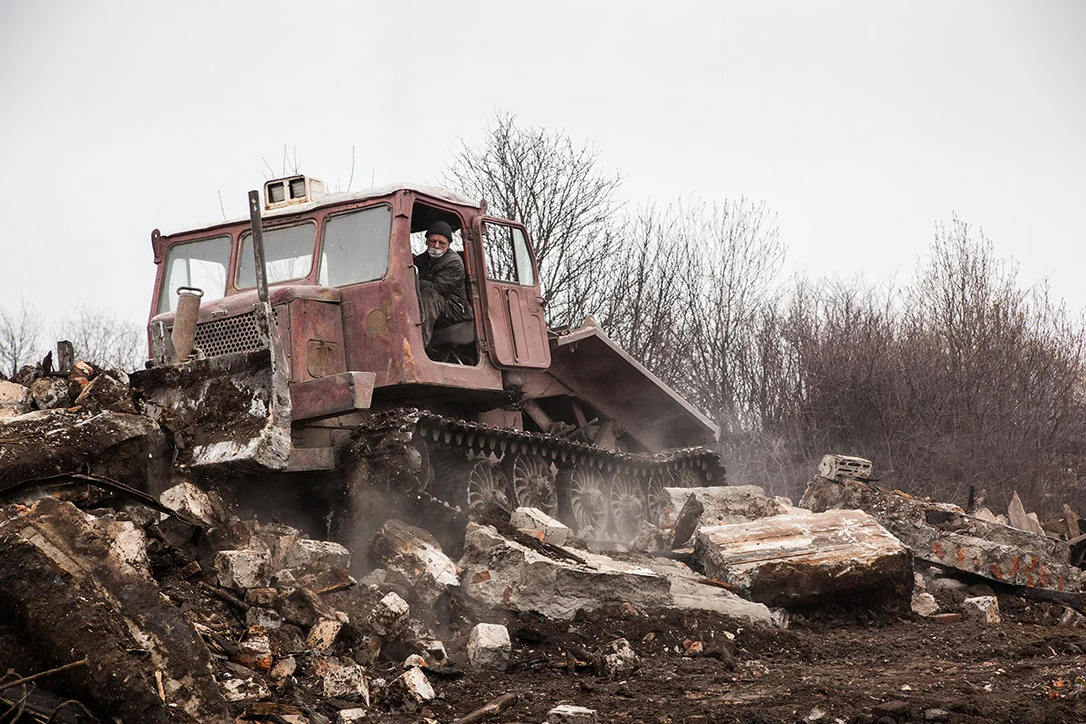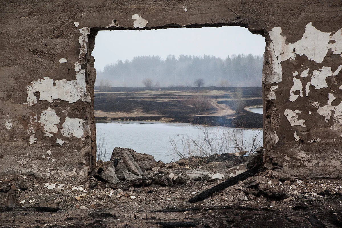 Посреди пепелищ торчат голландские печи. 30 апреля грейдеры ровняли с землей то, что осталось от домов, сараев и бань. Люди — те, до кого техника еще не дошла, — бродили по своим участкам, внимательно всматриваясь в выжженную почву, надеясь найти что-то случайно уцелевшее. Земля всё еще тлела, шел дым. От гари резало глаза.