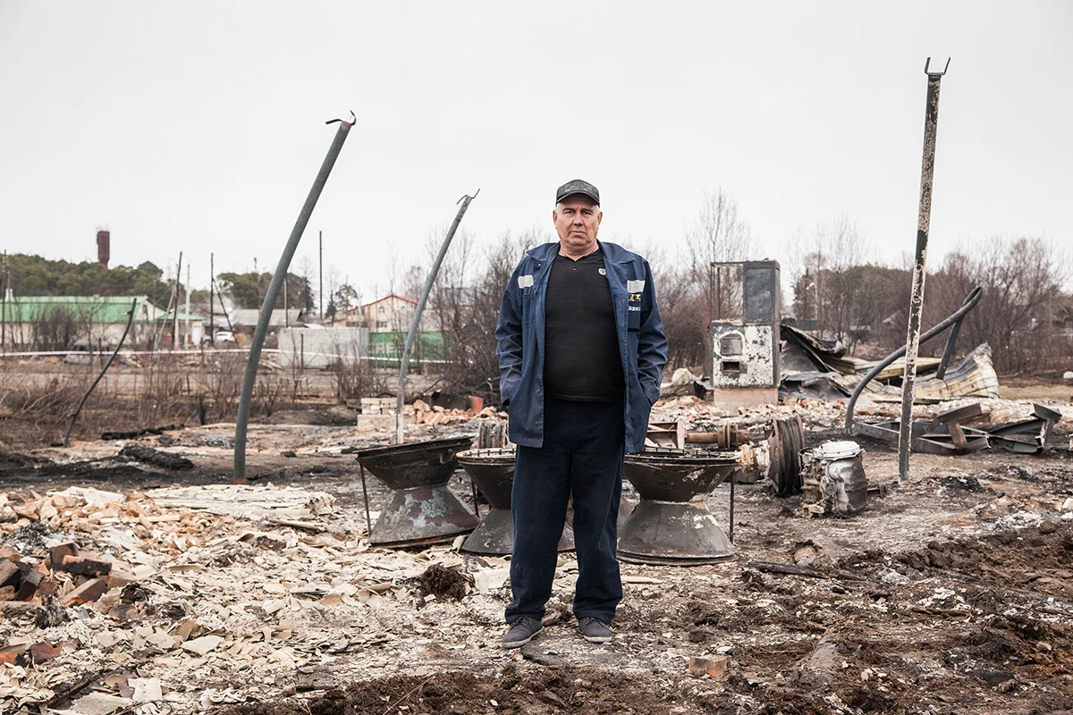 За его спиной грейдер ровняет с землей останки его жилища. Чернов стоит в той же одежде, в которой вышел из дома на работу в день пожара. Больше никаких вещей у него не осталось. На несколько месяцев его пустил пожить к себе приятель. Что делать дальше, он не знает.