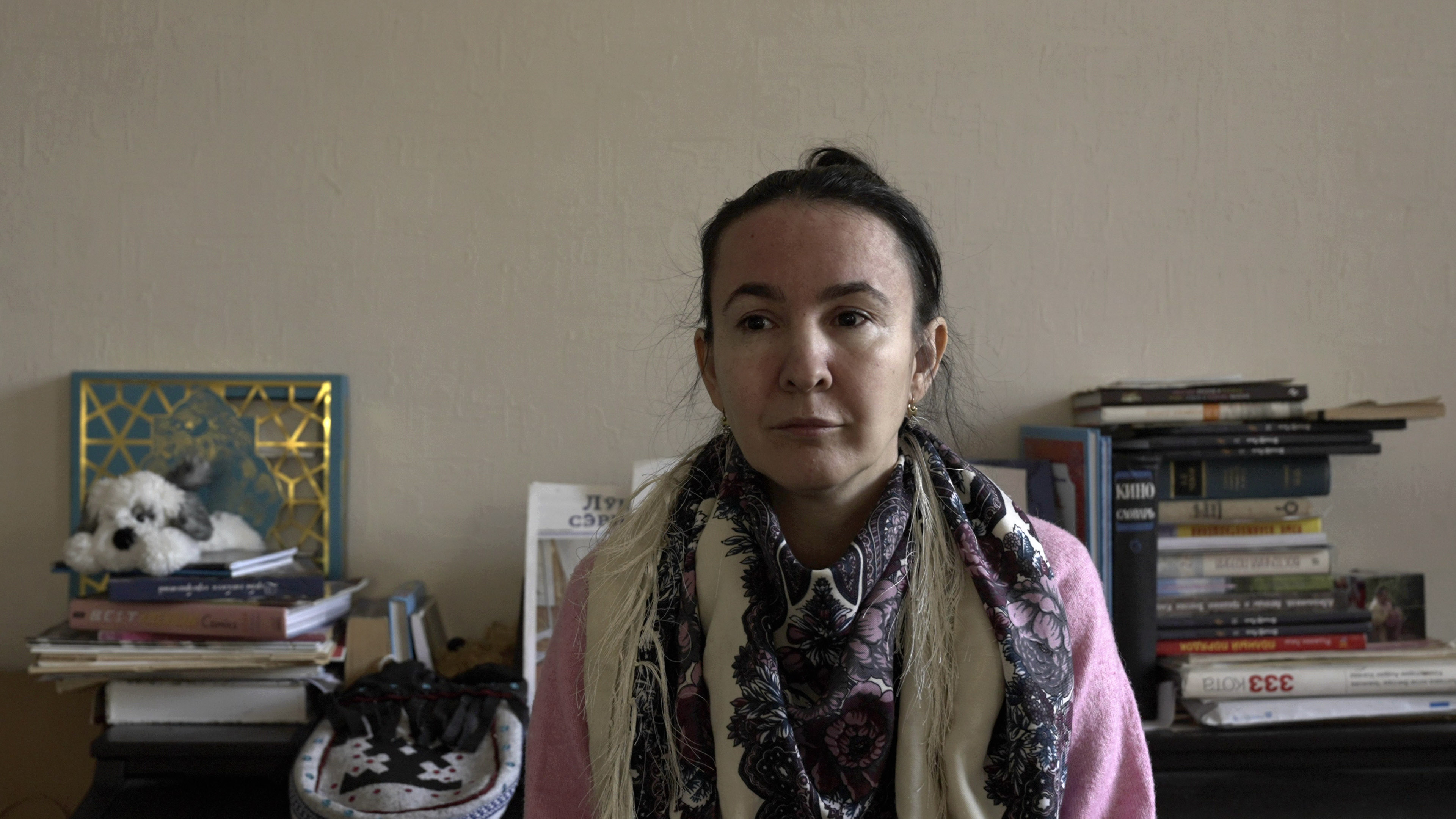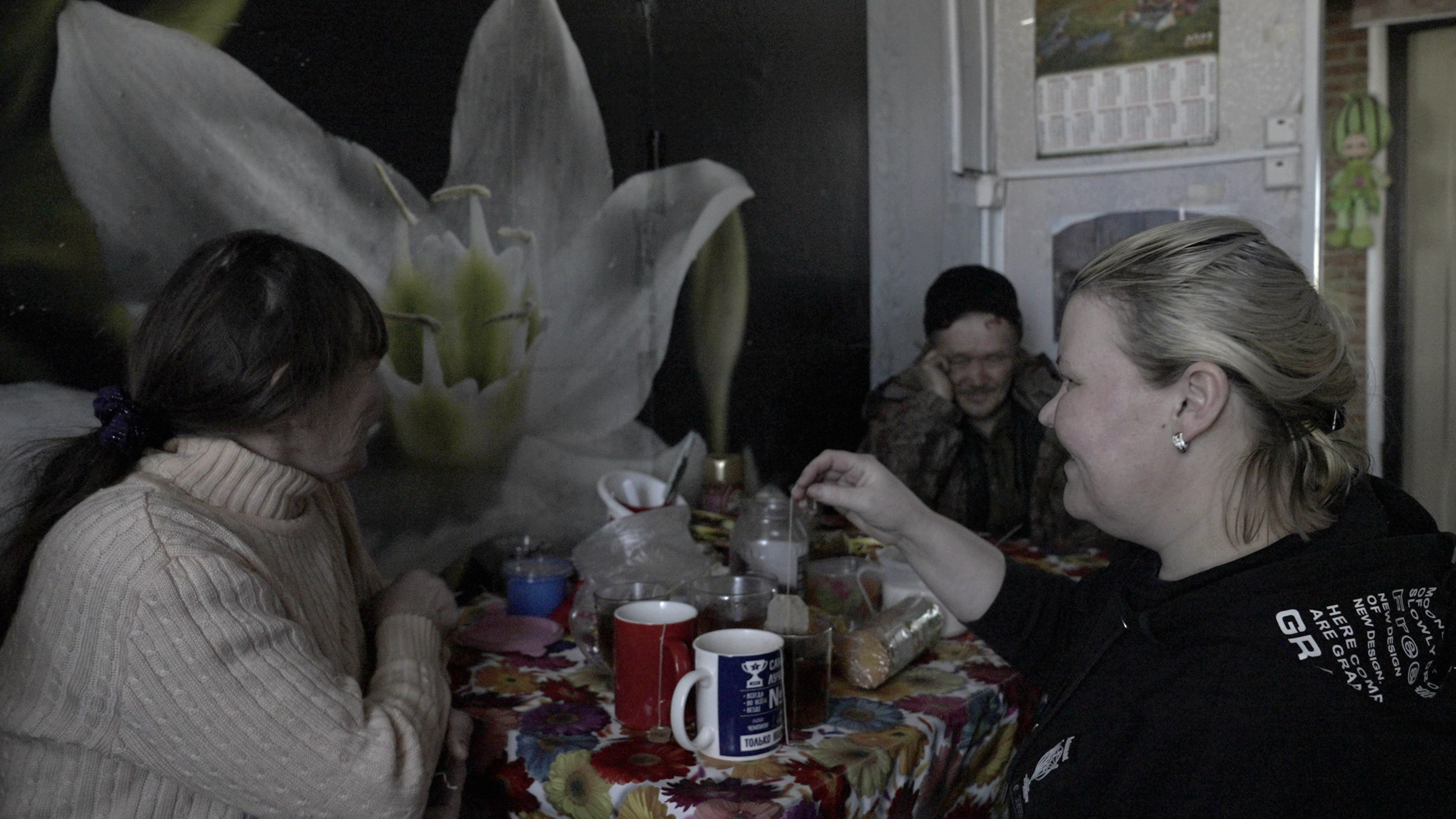 Небольшой дом в поселке Полуночное. Стол, заставленный множеством кружек. Календари с Богородицей, открытки с красными звездами на 23 февраля. Возле стола суетится крохотная, похожая на комнатную, охотничья собака. За столом сидит Лиза Бахтиярова – женщина около пятидесяти лет с длинной каштановой косой. Православные календари принадлежат ей.