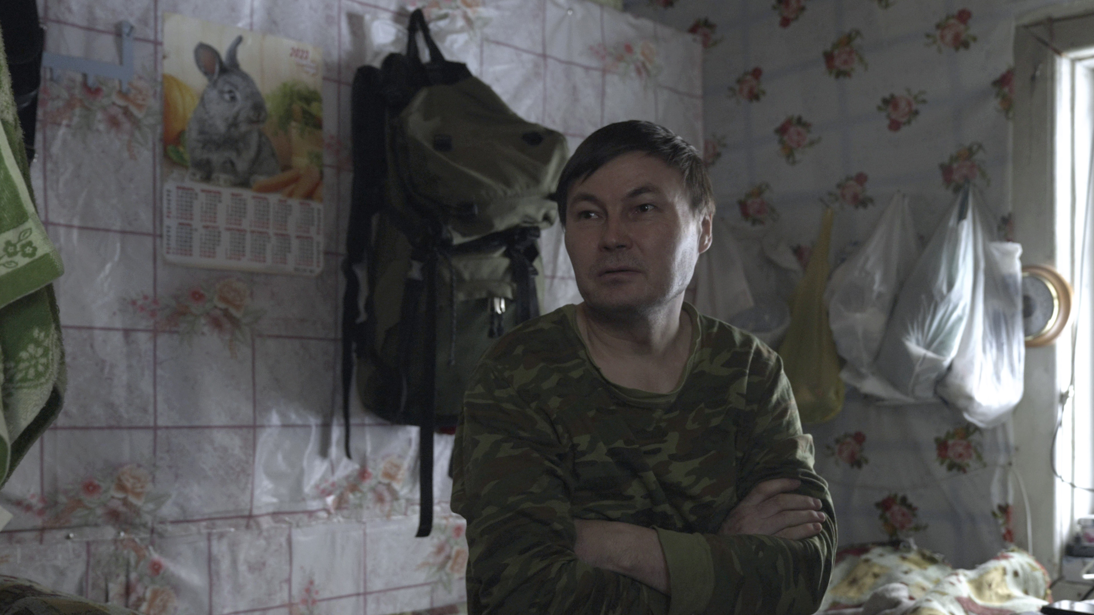 Охотник повышает голос, перекрикивая телевизор, вещающий из соседней комнаты про беспилотники НАТО и атаки ВСУ. Он рассказывает, как всю ночь не спал, прячась в избушке, а на рассвете отыскал и добил раненого зверя.