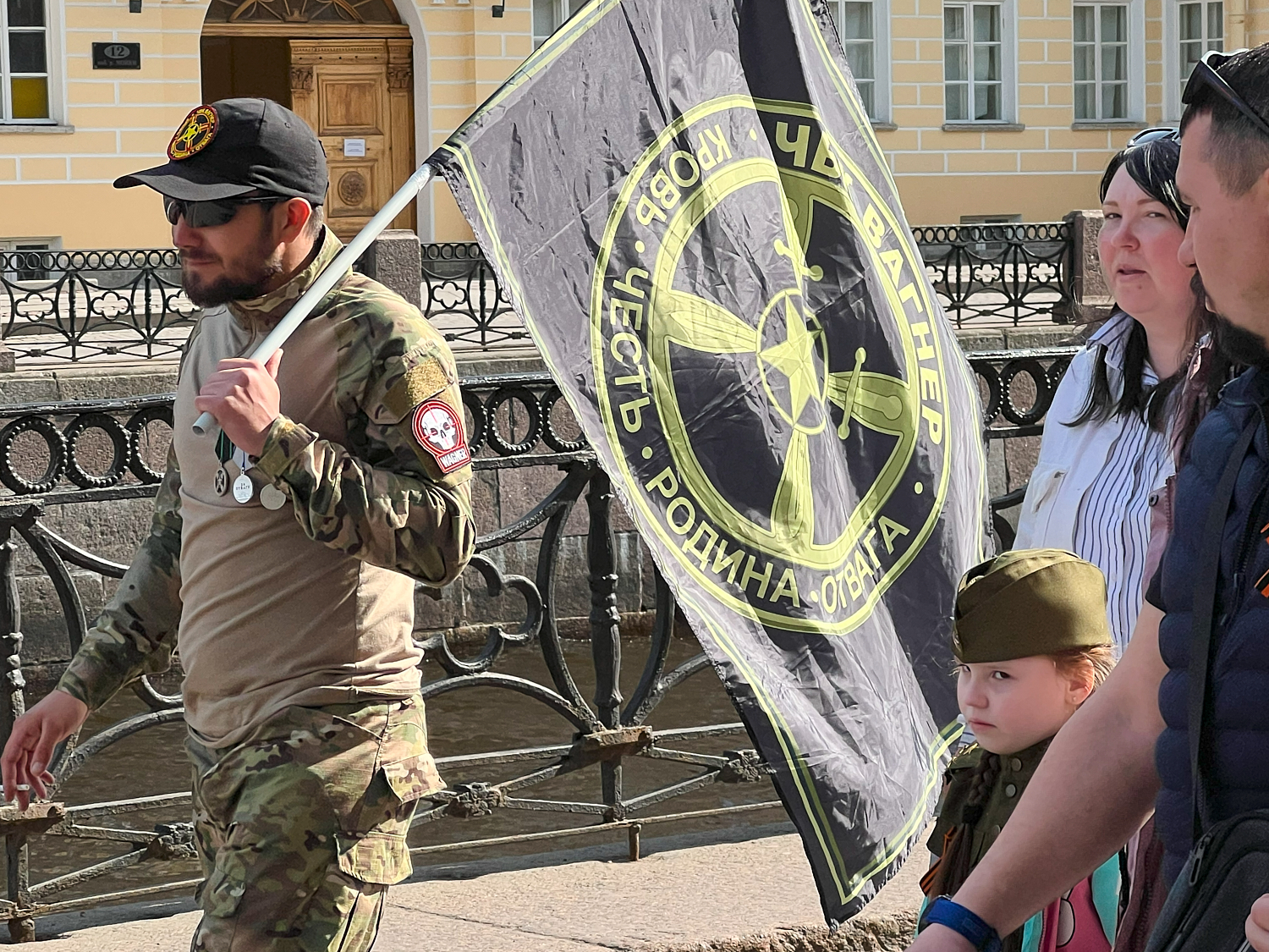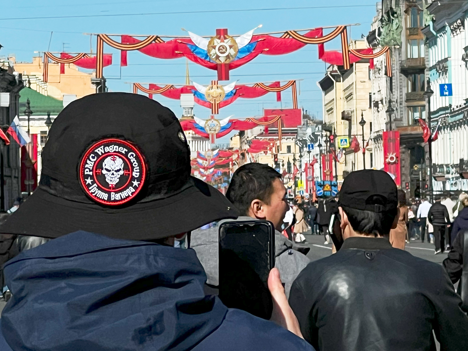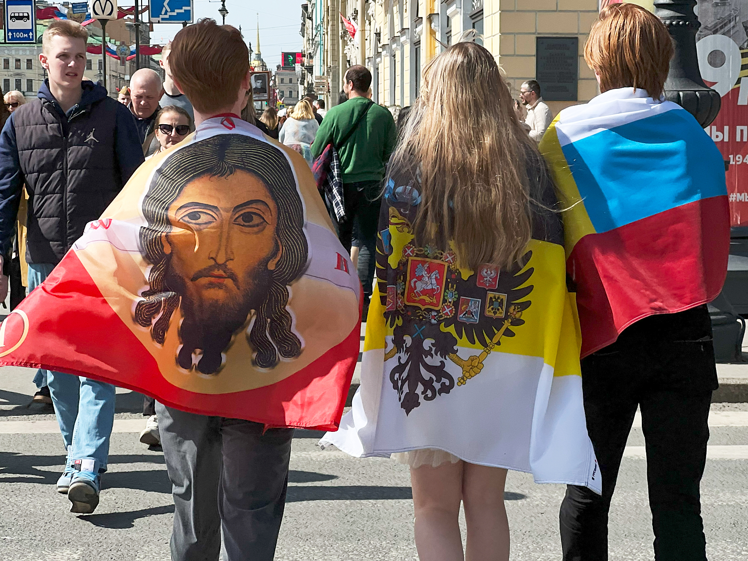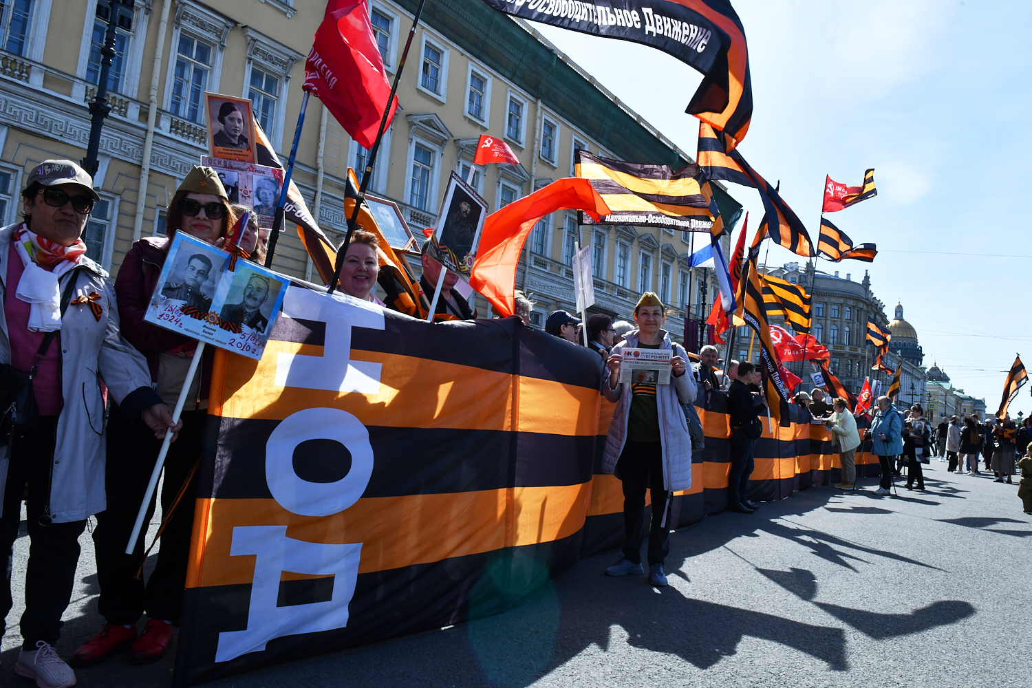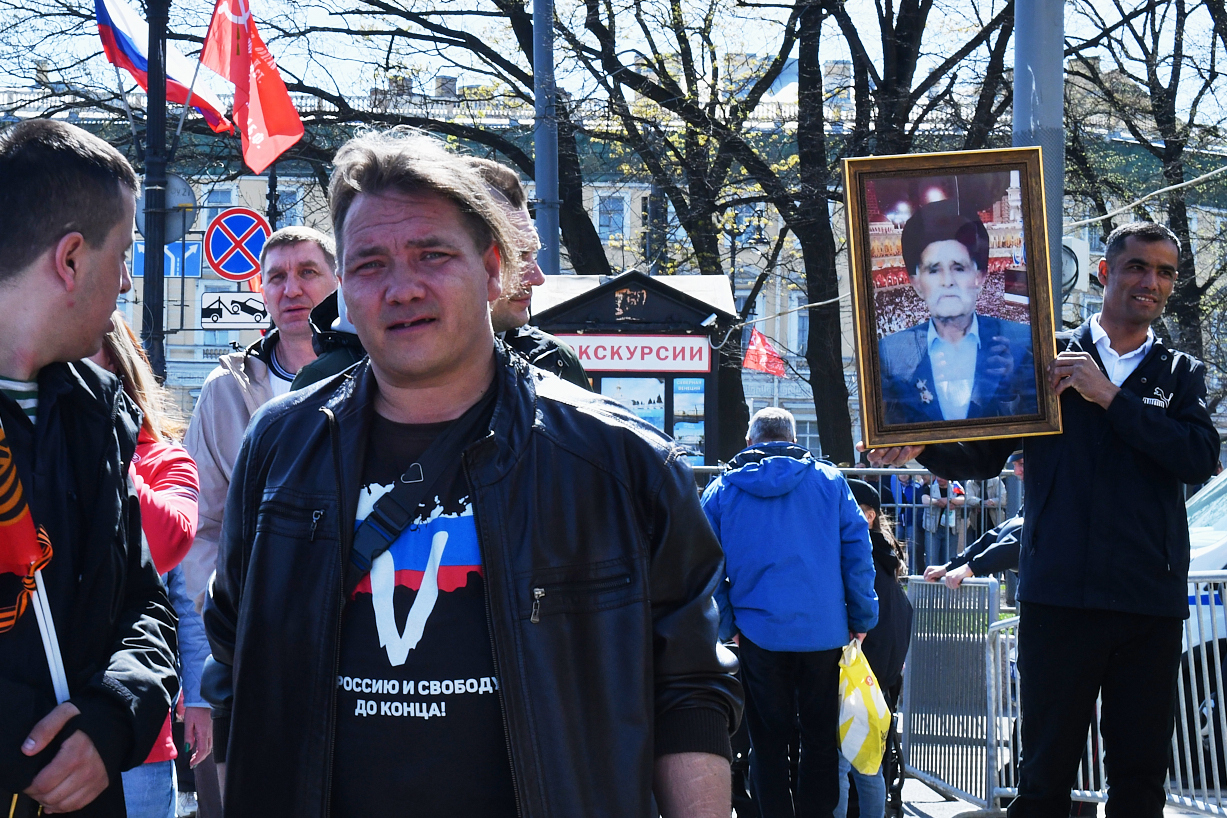 На Невском проспекте образовалось стихийное шествие «Бессмертного полка». Среди шествующих были участники Национально-освободительного движения и горожане в одежде с нашивками ЧВК «Вагнер», а также буквами Z и V.