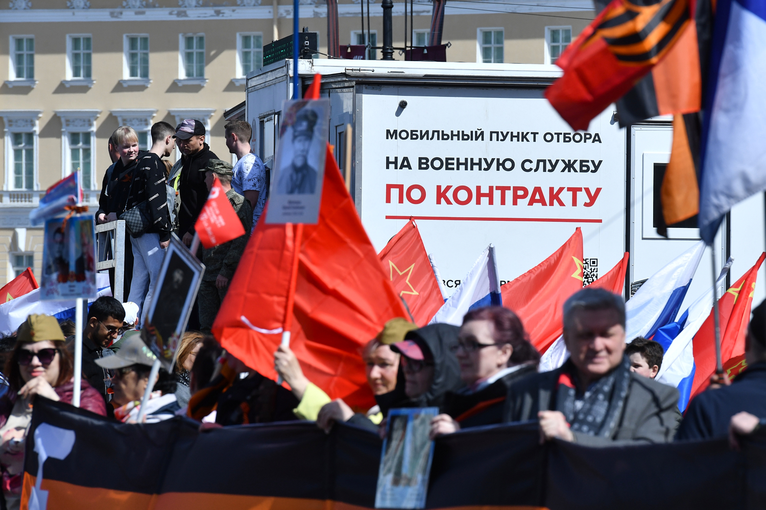 9 мая на Дворцовой площади прошел традиционный парад Победы и концерт с выступлениями Александра Розенбаума, Дмитрия Певцова и Елены Ваенги. На площадь также привезли мобильный пункт отбора на военную службу по контракту.