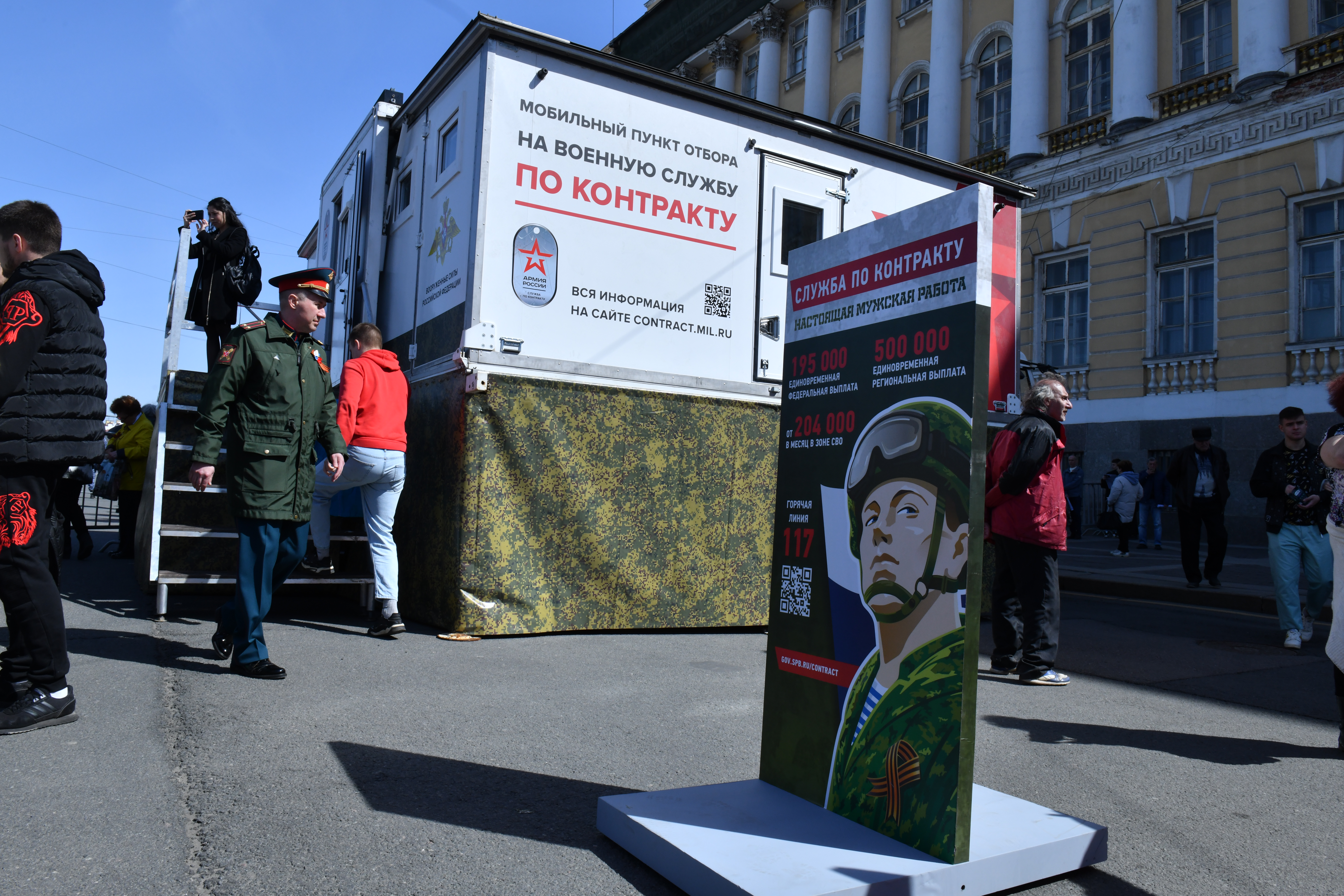 В Петербурге парад длился на пять минут дольше, чем в Москве, – 50 минут. После его завершения на Дворцовую площадь привезли мобильный пункт отбора на военную службу.