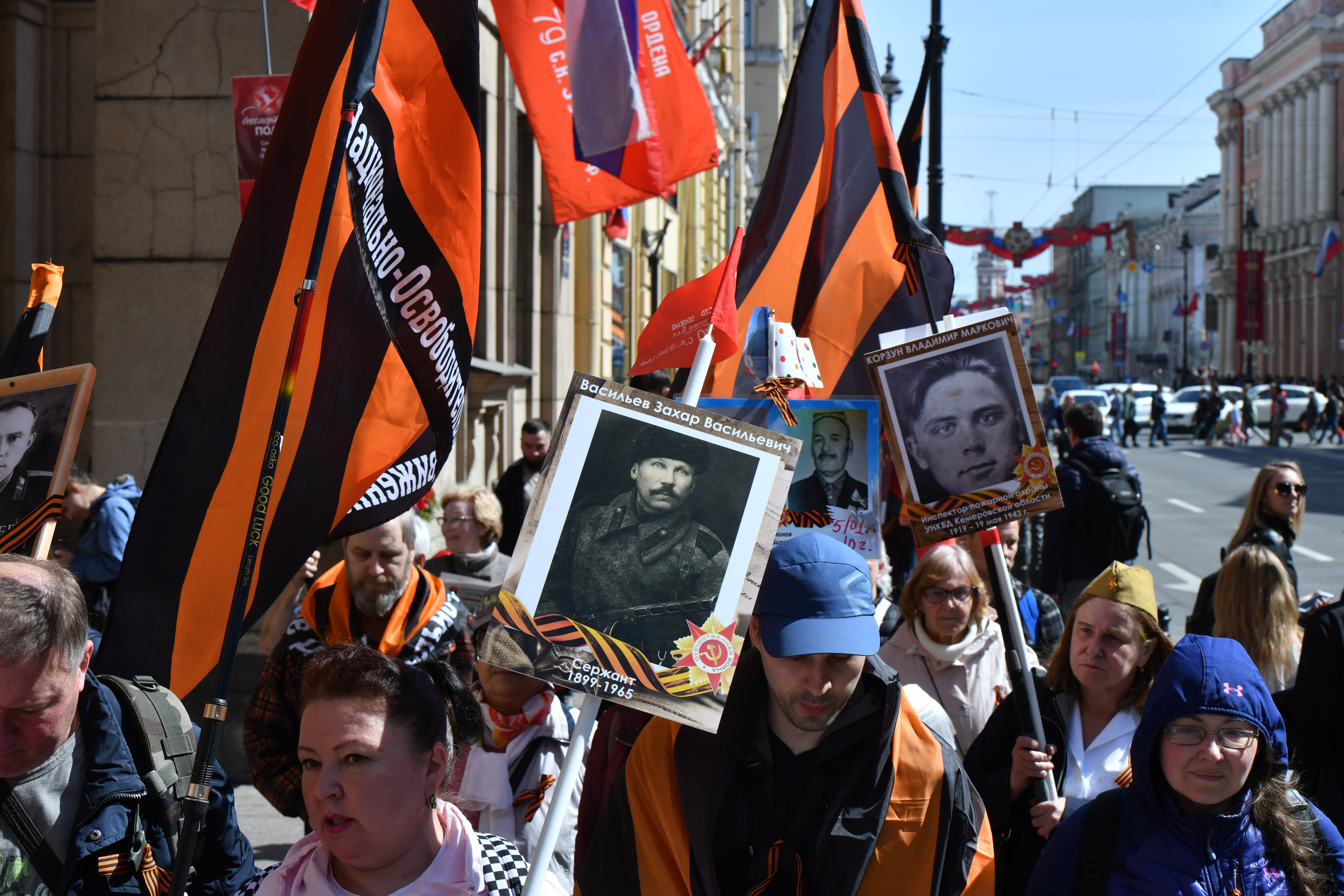 Как передает корреспондент Север.Реалии, некоторые жители города несли с собой портреты погибших на Великой Отечественной войне, хотя в 2023 году акция "Бессмертный полк" была отменена. Группа активистов провластного Национально-освободительного движения (НОД) прошла по Невскому проспекту, они также несли в руках портреты солдат.