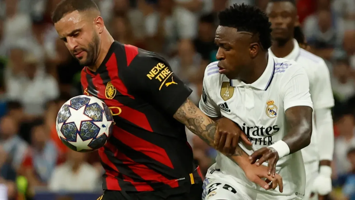 Защитник «Манчестера» Кайл Уокер (слева) в бою против Винисиуса Джуниора из «Реала» (справа) во время полуфинального футбольного матча первого матча Лиги чемпионов УЕФА между «Реал Мадрид» и «Манчестер Сити» в Мадриде, Испания, 9 мая 2023 года. EPA-EFE/JuanJo Martin