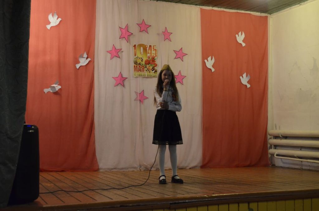 На окна клуба прилеплены белые бумажные голуби. На заборе — два больших плаката, нарисованных от руки на ватмане. На одном надпись «78 лет Победы», на другом нарисована девочка в военной форме, вокруг неё — георгиевская лента.