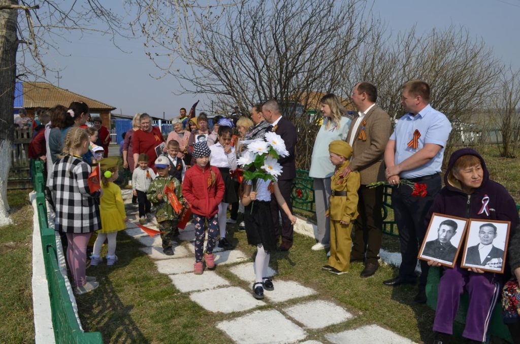 — Наталья Георгиевна, уже 10 часов, — кричит директору начальной школы заведующая клубом Миньзиля Байназарова. Та отвечает, что они уже идут. Дети выстраиваются у входа в оградку памятника и толпой в неё заходят. Многие девочки — в белых блузках и чёрных юбках, несут большие кусты искусственных ромашек. Из-за этих цветов детей почти не видно. Почти все школьники — в пилотках, в руках держат маленькие красные флажки — знамёна Победы.