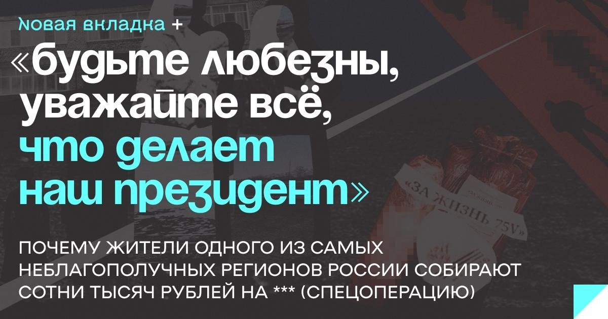 До тех, кто «на передке», гуманитарки доходит мало. Один из местных мобилизованных в разговорах с односельчанами просил собирать помощь «только деньгами и отправлять их на покупку коптеров». Другой земляк, вернувшийся с СВО, рассказал местным, что за полгода службы в зоне *** (спецоперации) его подразделение всего два раза получило продукты и вещи: «Так что деньги и коптеры».