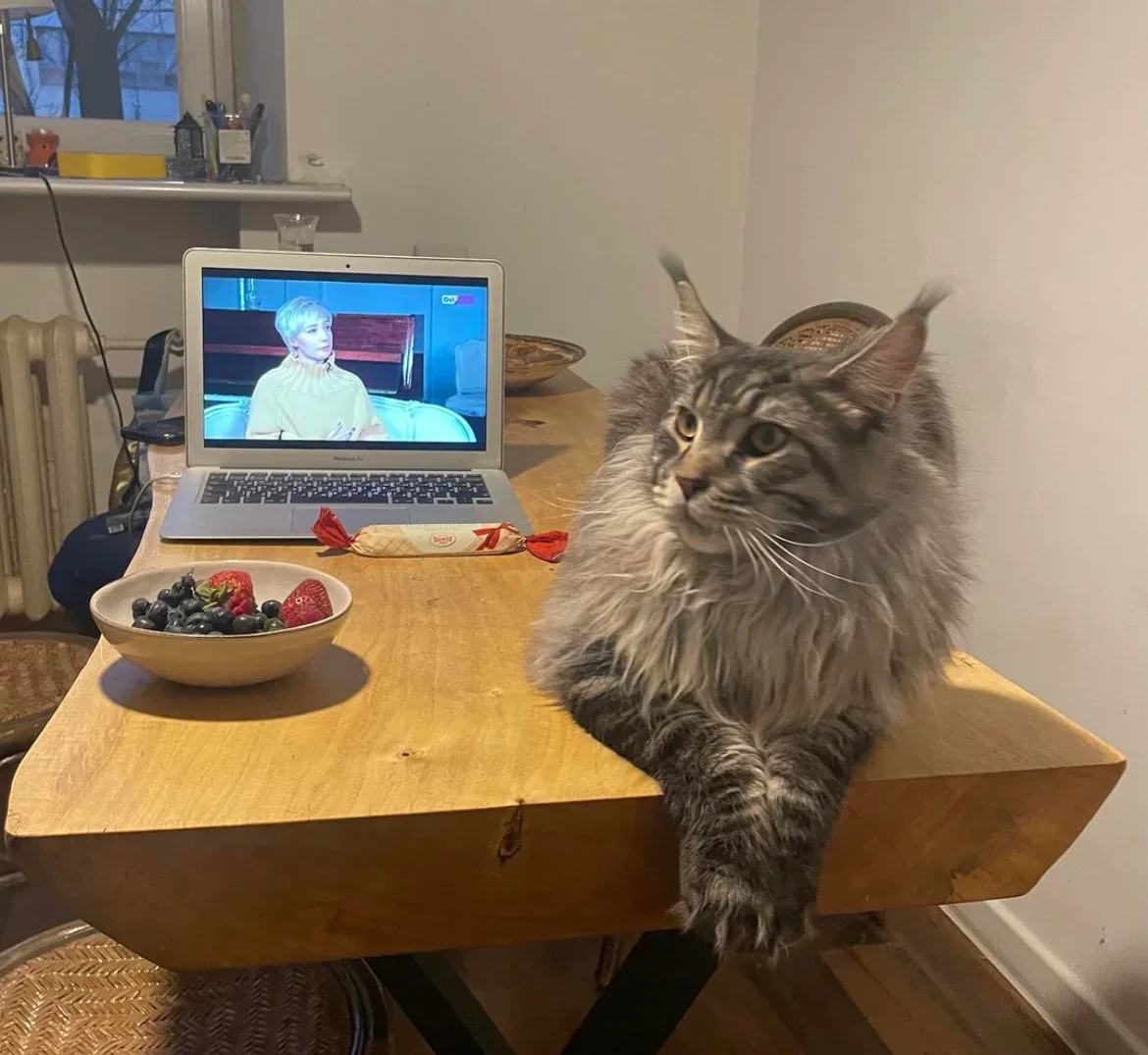 In Autumn 2022, the Berkovich family adopted a big, nine-kilo, green-eyed Maine Coon. Someone threw the cat out on the streets. Zhenya’s friend picked him up, got him treatment, and then gave him to Berkovich. At that time, she had another cat named Chipa. Berkovich took the cat in and named him Muratov — to honour editor-in-chief of Novaya Gazeta and Nobel Laureate Dmitry Muratov.