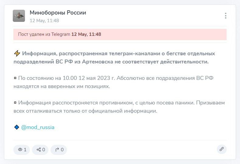 Около часа дня в телеграм-канале Минобороны появился, а затем сразу был удален, пост о том, что сообщения о бегстве российских военных с позиций в Бахмуте также не соответствуют действительности.