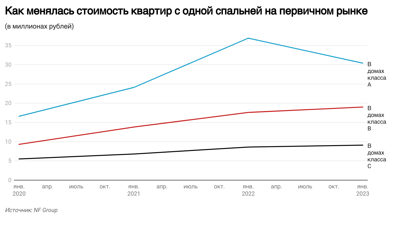По данным NF Group, в первом квартале 2023 года по отношению к аналогичному периоду 2022 года подешевели квартиры всех типов в домах класса A. Например, квартиры с одной спальней подешевели на 17,6 %, а квартиры с двумя спальнями — на 22,8 %.