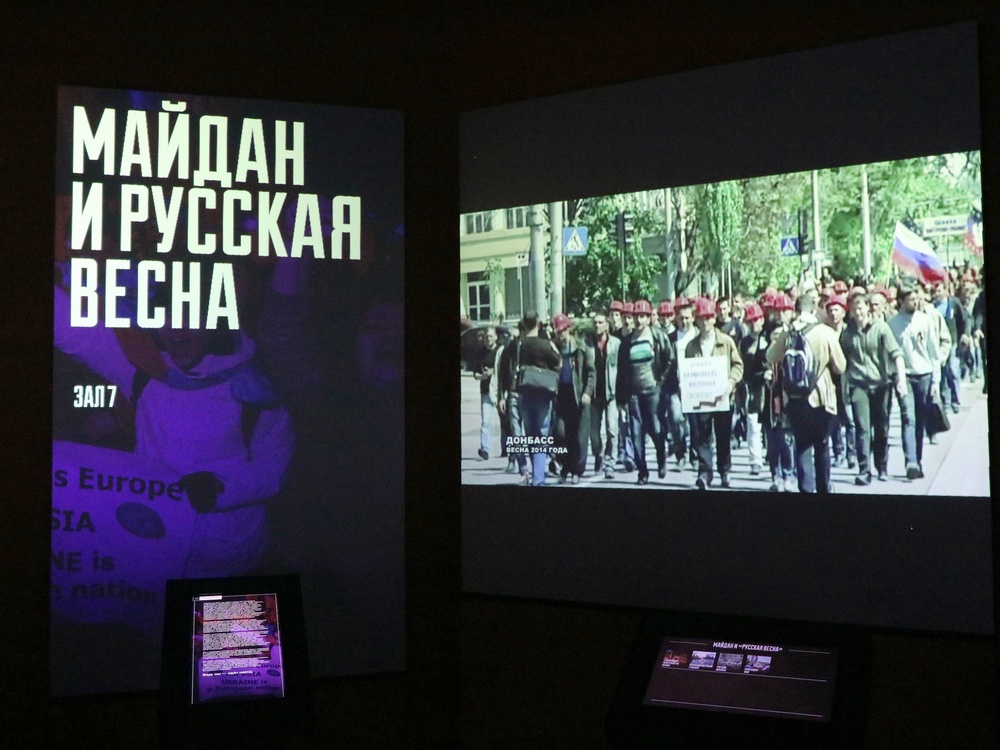 Экспозиция делала резкий переход от 2014-го к признанию независимости так называемых ЛНР и ДНР в 2022-м. В подводке говорилось, что в период с 2014 по 2020 год на территории Донецкой и Луганской областей Украины погибло 149 детей (при этом не упоминалось, что за 11 месяцев войны в Украине погибло не менее 431 ребенка, по данным ООН).