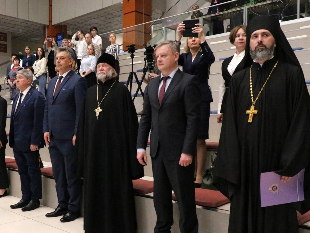 Викарий Санкт-Петербургской епархии епископ Назарий и министр просвещения РФ Сергей Кравцов (слева направо) во время открытия выставки «Украина. На переломах эпох». Фото: «Россия — Моя история» Санкт-Петербург / VK