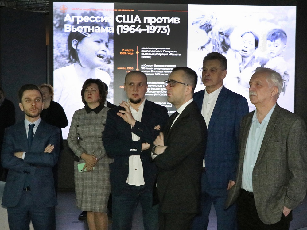 Иван Есин (третий слева) на открытии выставки «НАТО и лидер альянса. Хроники жестокости». Фото: Ирина Миронова / «Россия — Моя история» Санкт-Петербург / VK
