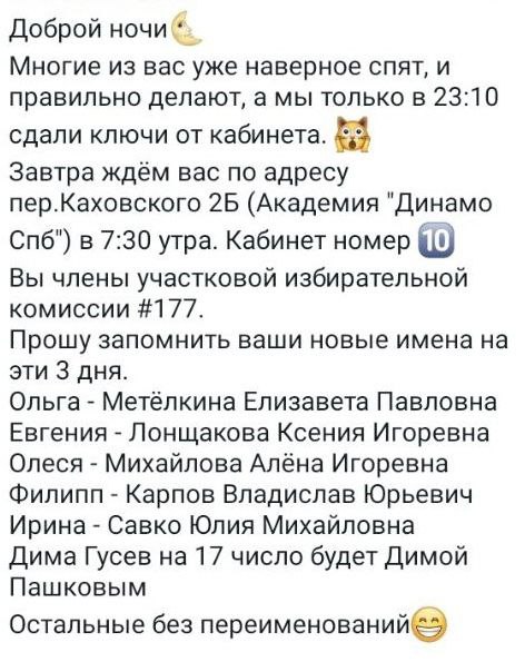 «Яблоко» также указывало, что в рабочем чате членов УИК № 177 велась переписка о «распределении ролей». «Прошу запомнить ваши новые имена на эти три дня», — опубликовали в чате.