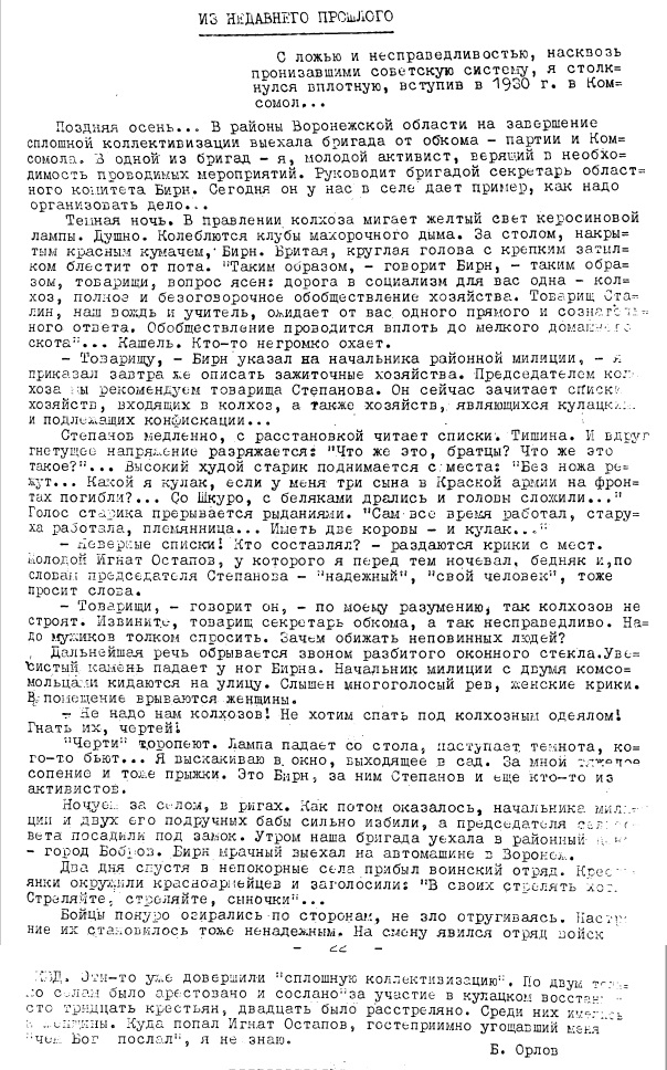 «Это письмо пишет человек, который, возможно, знаком вам если не лично, то как автор книжки «Мы приходим с Востока› и многих антисоветских статей в «Посеве», «Свободе», «Новом русском слове» - Борис Ольшанский. В 1947 г. я совершил тяжелое преступление перед Родиной - изменил ей и сбежал на Запад.