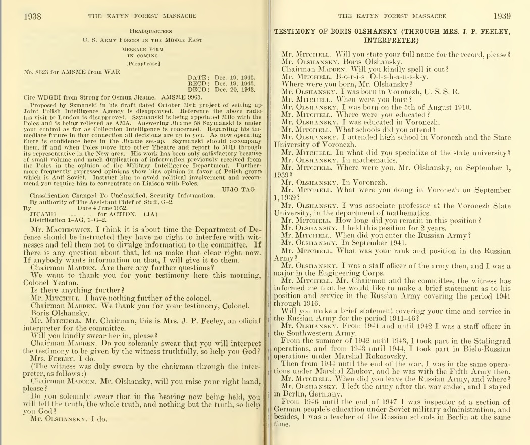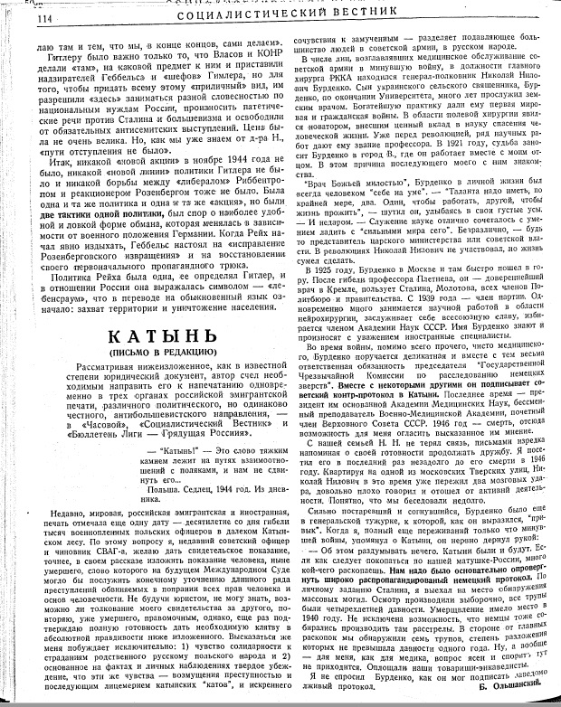 Нет никаких сомнений, что расстрелы в Катыни действительно были совершены НКВД в 1940 году (хотя свихнувшаяся под буквой Z современная российская пропаганда уже и это ставит под сомнение), тем не менее, рассказ Ольшанского был несомненно лжесвидетельством, совершенным из лучших, но скорее из материальных побуждений. Как сказали бы сегодняшние блогеры, он решил «хайпануть на теме». И надо сказать, это ему удалось. Через два года его пригласили дать показания перед комиссией Мэддена, комиссией американского Конгресса, расследовавшей катынское дело, там он рассказ о разговоре с Бурденко повторил, «вспомнив» еще, что дело было в конце апреля 1946 года, Бурденко сидел в кресле в генеральской папахе, а беседа продолжалась минут 40. Изложение его рассказа через пару дней было также опубликовано в нью-йоркской газете «Новое Русское Слово».
