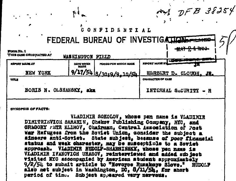 «Согласно м-ру КЛИМОВУ (Григорий Климов, на тот момент председатель Центрального объединения послевоенных эмигрантов) у объекта есть проблемы с женой и детьми. Объект нервозен и имеет много долгов. КЛИМОВ указал, что объект занимал деньги у студентов, посещавших его занятия в институте русского языка в Джорджтаунском университете, Вашингтон. Он оценивает долги объекта на данный момент примерно в 3000 долларов. Он полагает, что объект вскоре может быть уволен из-за неплатежеспособности.