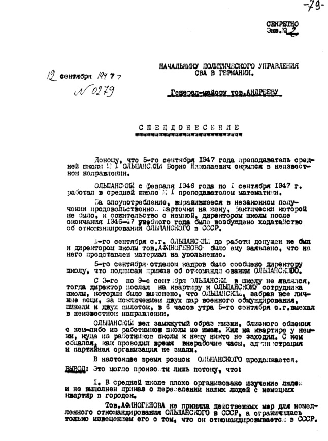 «Доношу, что 5 сентября 1947 года преподаватель средней школы № 1 Ольшанский Борис Николаевич скрылся в неизвестном направлении. Ольшанский с февраля 1946 года по 1 сентября 1947 года работал в средней школе № 1 преподавателем математики.