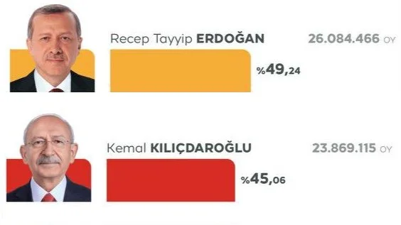 69-летний Эрдоган лидирует с перевесом более чем в два миллиона голосов. Его главный соперник, 74-летний Кемаль Киличдароглу, получил 45% голосов. Политик Синан Оган набрал 5,2%.