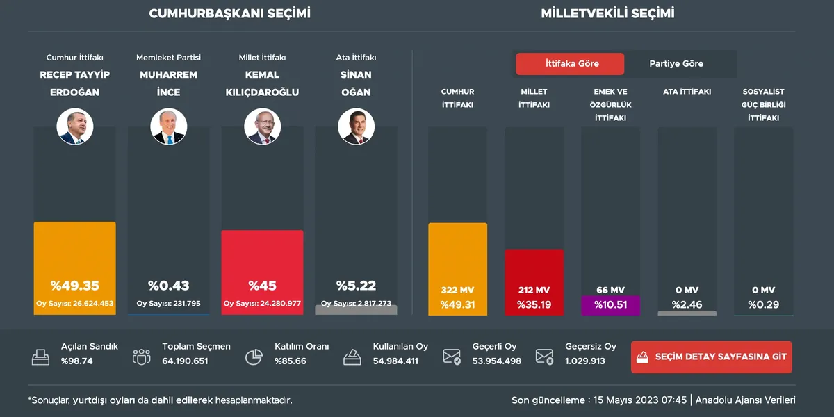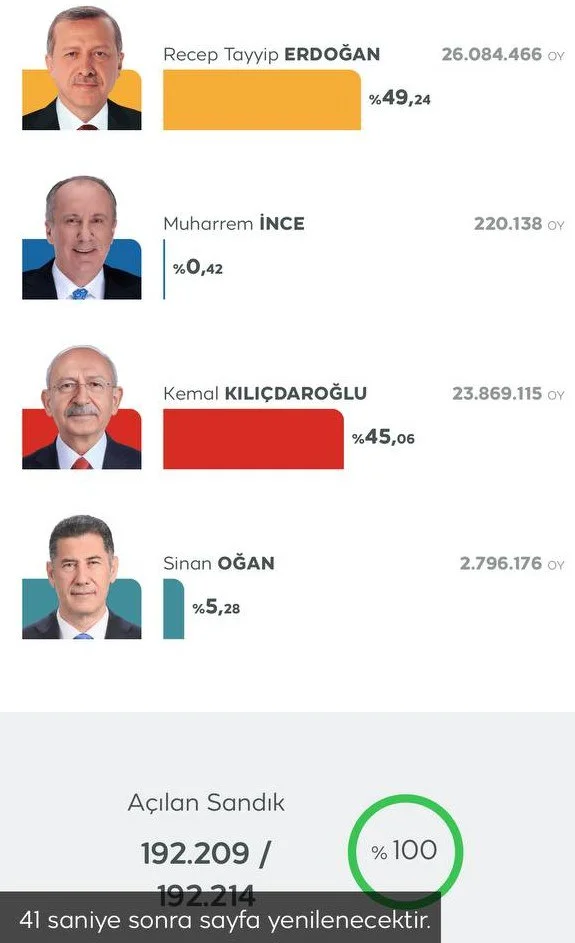 После обработки 100% бюллетеней Эрдоган получил 49,24% голосов, Кылычдароглу — 45%, сообщает государственный телеканал TRT.