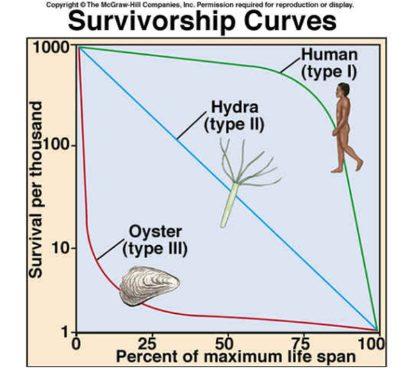 На рис. 1 показаны так называемые кривые выживания — это традиционный способ изображать динамику старения. По вертикальной оси откладываем численность когорты. Когорта — это, например, тысяча животных, родившихся в одно время. Дальше за ними следят, как они постепенно умирают. Здесь по горизонтали отложен возраст, а по вертикали — число доживших. В этих координатах, если старения нет, то график — прямая линия (каждый год умирает, например, один процент). Если наклон растет, как в случае человека, это значит, что старение есть.