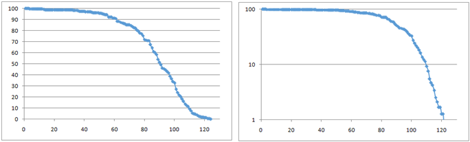 На рис. 2 — реальная линия выживания наших лабораторных дрозофил. Это наши эмпирические данные, когда я работал на кафедре биологической эволюции МГУ. Дрозофилы после выхода из куколки сначала практически не умирают. Они молодые, крепкие, здоровые. Потом, начиная где-то с 40–50 дней, они начинают потихоньку умирать, потом всё быстрее, быстрее. Это значит, что есть хорошо выраженное старение, и должен вам сказать, что линии выживания людей выглядят практически так же, как дрозофильные: такая же характерная выпуклая кривая с сильно выраженным старением.