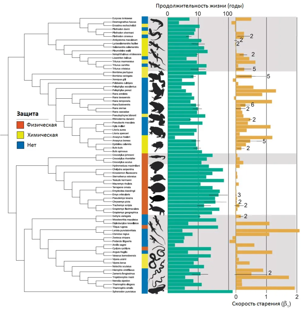 Рис. 3. Эволюционное древо изученных видов амфибий и рептилий и показатели их долголетия (время в годах от начала размножения до гибели 95% особей). Скорость старения оценена по модели Гомперца, согласно которой вероятность умереть в текущем году увеличивается в eβ1 раз с каждым прожитым годом. Горизонтальными серыми и белыми полосами выделены отряды: хвостатые амфибии, бесхвостые амфибии,