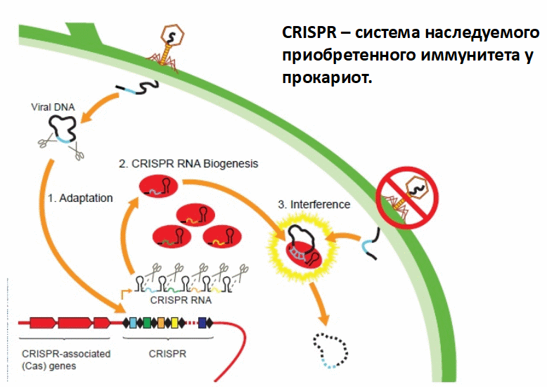 1) фрагменты вирусной ДНК вставляются в CRISPR-кластер («адаптация»);