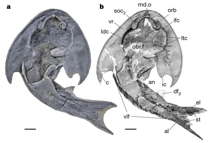 Рис. 6. Tujiaaspis vividus (фото и прорисовка). Длина масштабного отрезка — 4 мм, длина животного — около 7 см. Хорошо видна пара «плавниковых складок» — длинных вентролатеральных плавников. Из статьи в Nature6