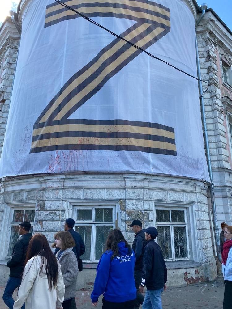 Как сообщал YarNews, рано утром 9 мая здание Центра патриотического воспитания, на котором висит баннер с символом Z в цветах георгиевской ленты, облили красной краской.