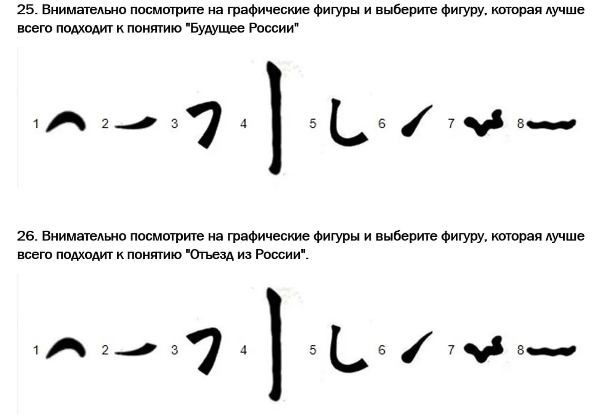 Были и «креативные» вопросы. Респондентов просили выбрать, какая из абстрактных фигур лучше всего подходит словосочетаниям «ситуация в России», «президент России», «мобилизация», «отъезд из России».