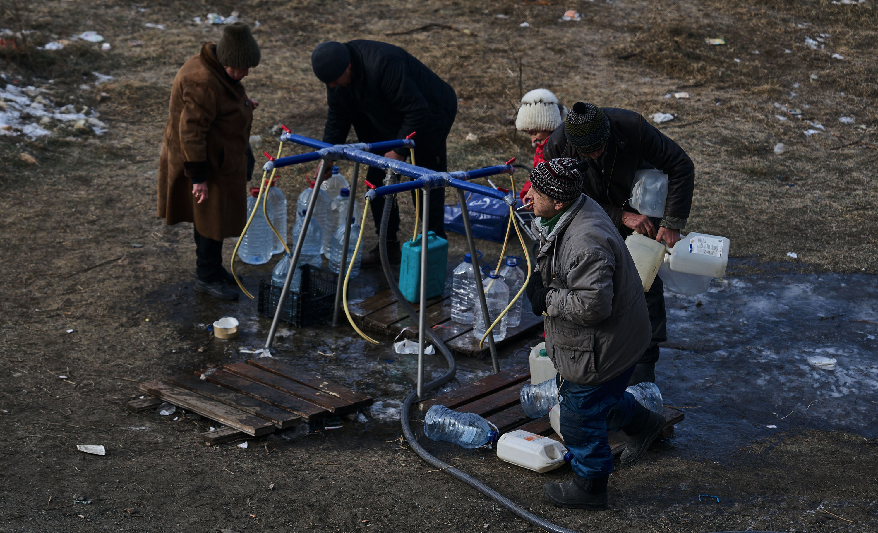 Local residents collecting water, Bakhmut, 10 February 2023. Photo by Libkos / AP