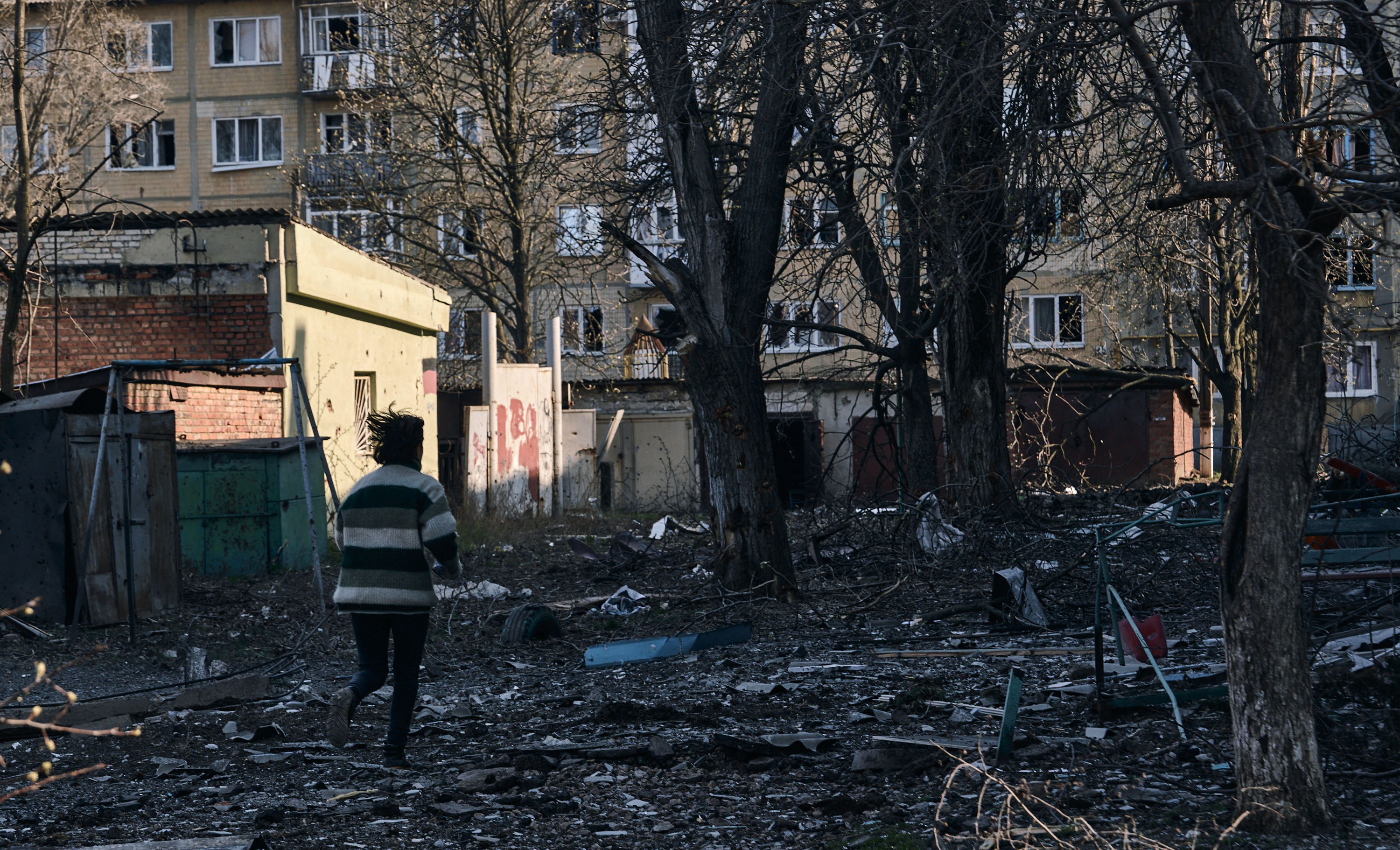 A local resident runs past destroyed houses in Bakhmut on 9 April 2023. Photo: Libkos / AP