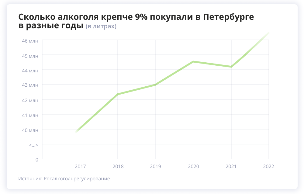 В 2022 году в Петербурге на 6 % вырос уровень потребления алкоголя крепостью выше 9 %. За четыре месяца 2023-го петербуржцы приобрели треть от того, что купили за весь прошлый год, — то есть замедления продаж не происходит.