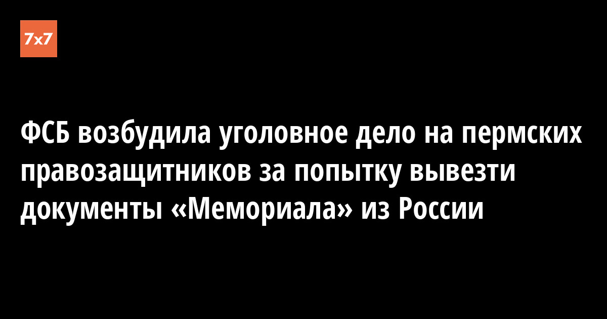 УФСБ по Пермскому краю возбудила уголовное дело на главу пермского «Мемориала» Роберта Латыпова и председателя Центра исторической памяти Александра Чернышова. Их обвинили в «покушении на контрабанду культурных ценностей», потому что правозащитники пытались вывезти в Германию архивные документы организации. Об этом «7x7» сообщили представители «Мемориала».