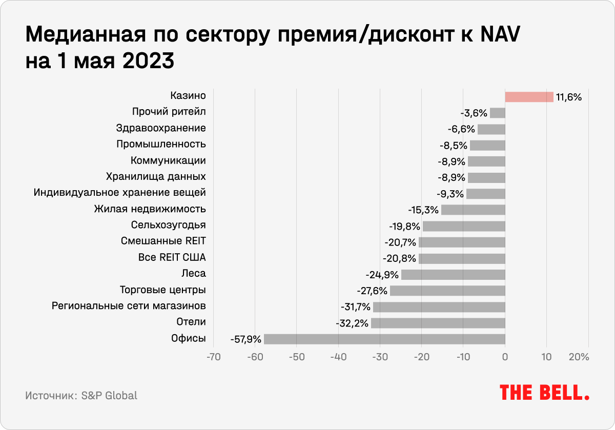 Казино — единственный сектор, который торговался с премией к цене, — на 11,6%. Их помещения довольно специфичны, поэтому аренда оформляется долгосрочными контрактами. Кроме того, после пандемии наблюдается высокий отложенный спрос.