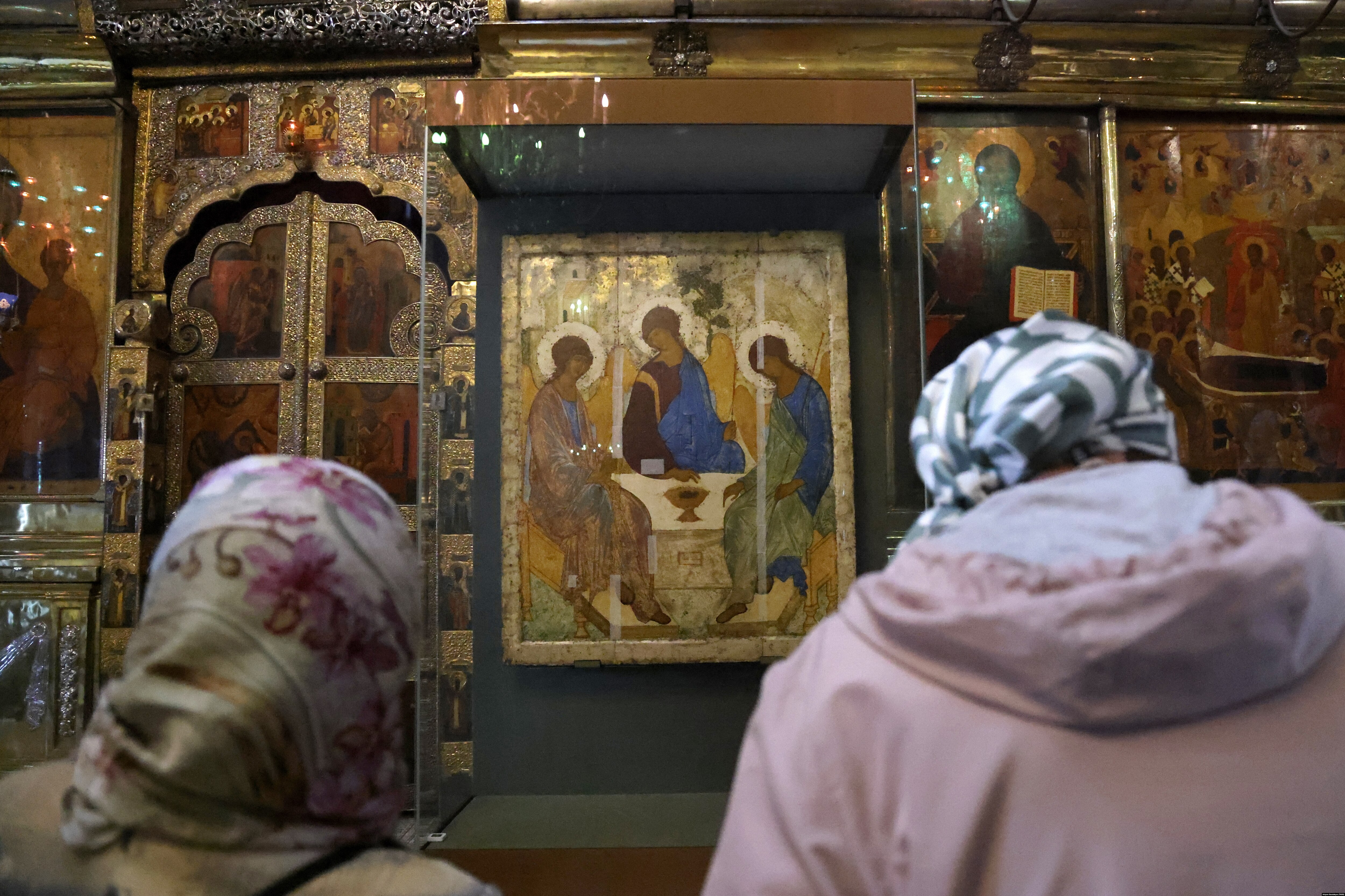 Икона Святой Троицы была написана Андреем Рублевым в XV веке, это одна из двух работ великого иконописца, где его авторство доподлинно известно, и одна из самых прославленных русских икон. В 1929 году ее из Троицкого собора Троице-Сергиевой лавры передали в Третьяковскую галерею. После того как прошлым летом ее вывозили на некоторое время в обратно в Троицкий собор, реставраторы нашли на ней 61 повреждение. Специалисты категорически возражают против любых перемещений бесценной иконы, предупреждая, что это однозначно погубит памятник. Однако 15 мая 2023 года на сайте патриархии появилось сообщение, что икона решением Владимира Путина возвращена Русской православной церкви. При этом ей предстоит не одно путешествие – предполагается, что уже 4 июня ее привезут на две недели в храм Христа Спасителя, затем в течение года ей предстоит плановая реставрация, а потом ее переместят в Троицкий собор Троице-Сергиевой лавры.
