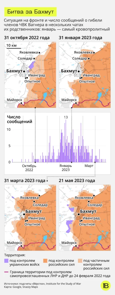 Сообщения в чатах о гибели членов ЧВК мы сопоставили с фронтовыми сводками ISW и описали, в какие дни ЧВК Пригожина теряла больше всего людей и что в те даты происходило на поле боя.