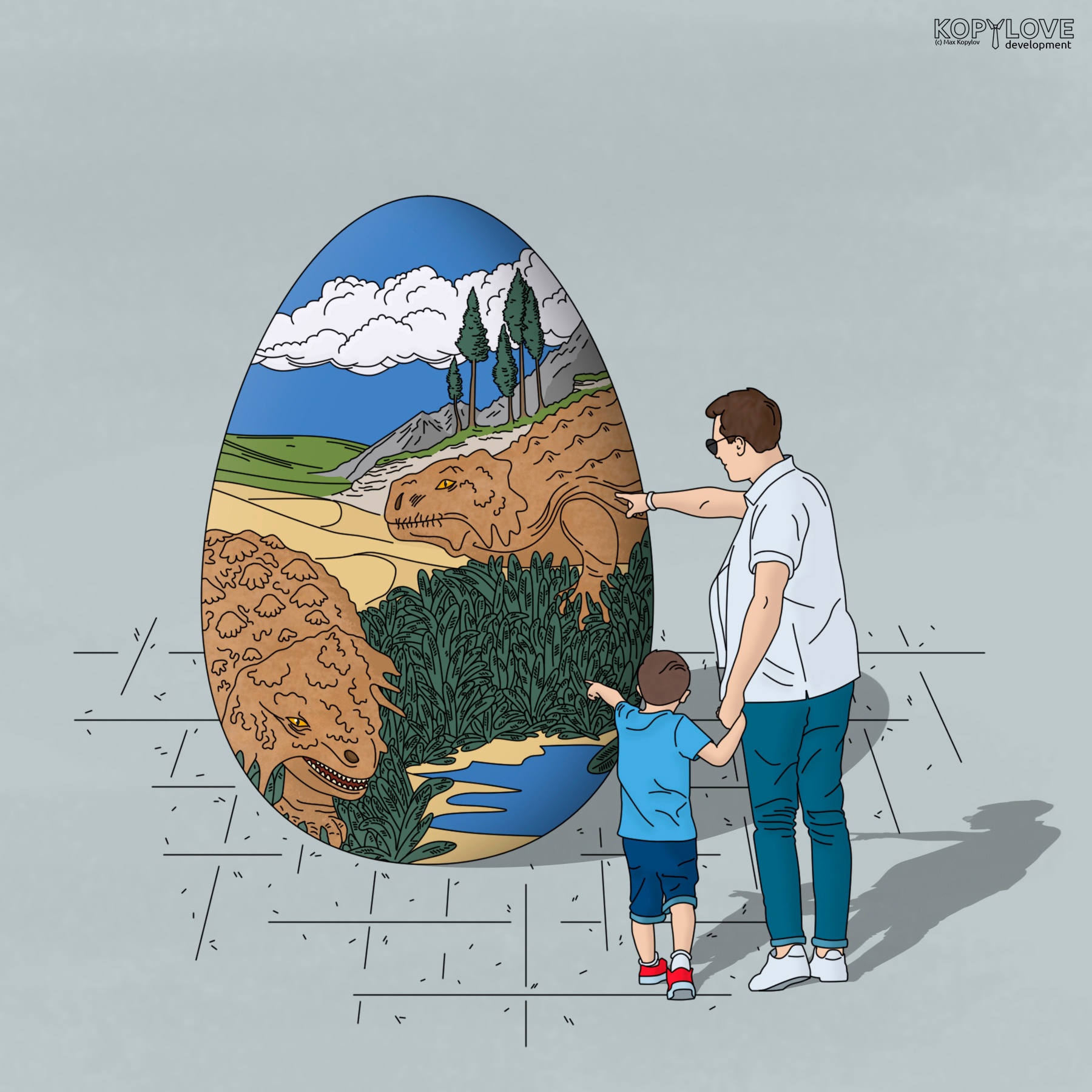 P. S. Поскольку у меня нет степени по палеонтологии, я нагло взял за основу для прорисовки изображения на яйце черно-белую графику «Скутозавры Карпинского в позднепермском ландшафте» из энциклопедии «Я познаю мир: палеонтология». М.: Астрель; АСТ, Ермак. 2004. Рис. на с. 200.