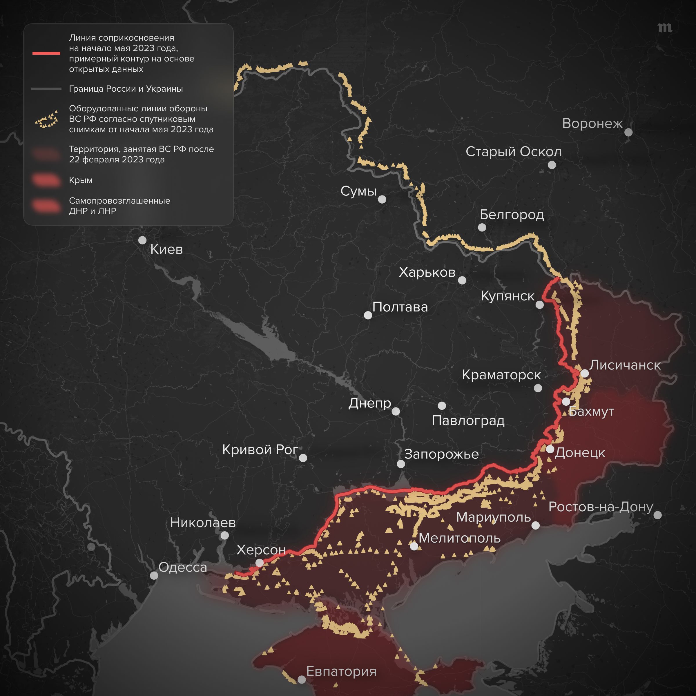 Советник главы офиса президента Михаил Подоляк утверждает, что контрнаступление ВСУ уже началось (вот четыре сценария, как оно может развиваться). Готовясь к нему, российская армия построила обширную систему оборонительных рубежей. Она протянулась от западной оконечности Крыма до границы России и Беларуси (правда, не помешала «диверсантам» атаковать Белгородскую область 22 мая) — к таким выводам пришли независимые военные эксперты и журналисты международных изданий, изучившие спутниковые снимки. «Медуза» собрала главные выводы этих исследований.