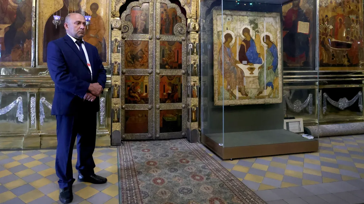 «Троица» Андрея Рублева, доставленная в Троице-Сергиеву Лавру на празднование 600-летия обретения мощей Сергия Радонежского из Третьяковской галереи. Фото: Артем Геодакян / ТАСС