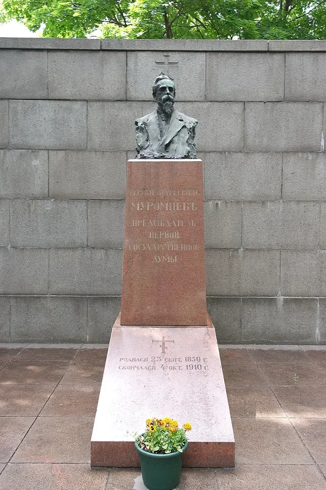 Каждый раз, когда я бываю на Новом Донском кладбище, я обязательно прихожу к могиле Сергея Андреевича Муромцева. Это не обычная могила стандартного размера, каких тут сотни в ровных рядах под деревьями, а обширная гранитная площадка, в конце которой у стены, на высоком постаменте, стоит бюст Муромцева. Стена, площадка и постамент вычерчены острым карандашом великого архитектора Федора Шехтеля, а бюст изваял русский итальянец — скульптор Паоло Трубецкой. Двое талантливых людей сделали всё для того, чтобы место сохраняло живую память о Муромцеве, но ничего не получилось: стоишь на граните перед бюстом и чувствуешь пустоту.