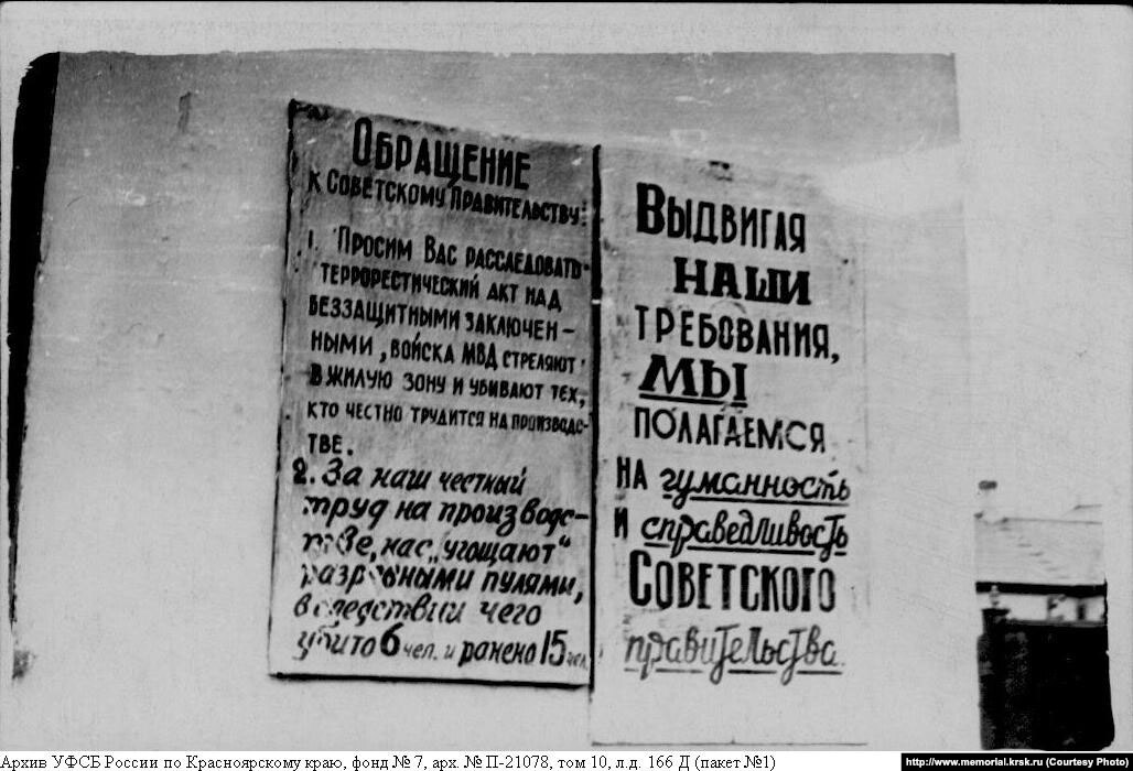 27 июня воздушный змей разнес над Норильском первую листовку каторжан, где говорилось: "Нас расстреливают и морят голодом. Просим советских граждан сообщить правительству о произволе над заключенными в Норильске. Каторжане Горлага".