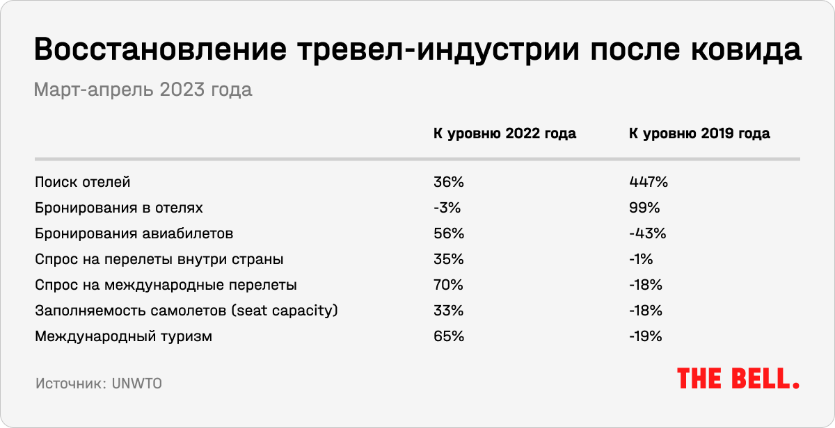 В 2022 году за границы своих стран выезжали более 900 млн туристов — в два раза больше, чем годом ранее, но лишь 63% от того, что было до пандемии. UNWTO ожидает, что в 2023 году их число вырастет до 80–95% от допандемийного уровня.