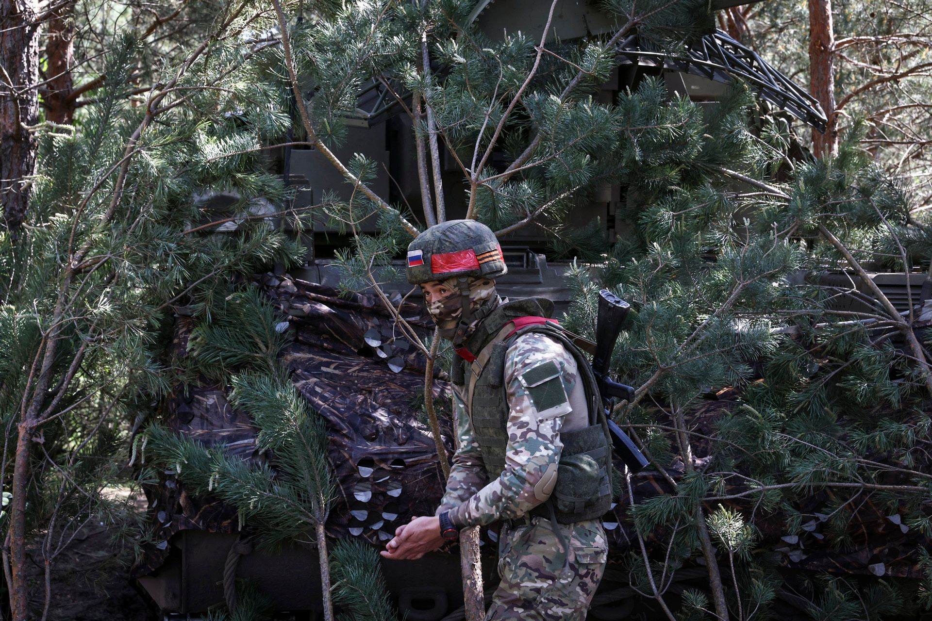 Российский зенитчик из Центрального военного округа у одной из машин зенитного ракетного комплекса (ЗРК) «Тор-М1». Комплексы являются одним из основных средств борьбы с дронами ВСУБоевая машина 9А330 ЗРК «Тор-М1»Пуск ракеты «Тор-М1» по целиРоссийский зенитчик позирует съемочной группе с закрытым лицом и патчем с символикой СССР