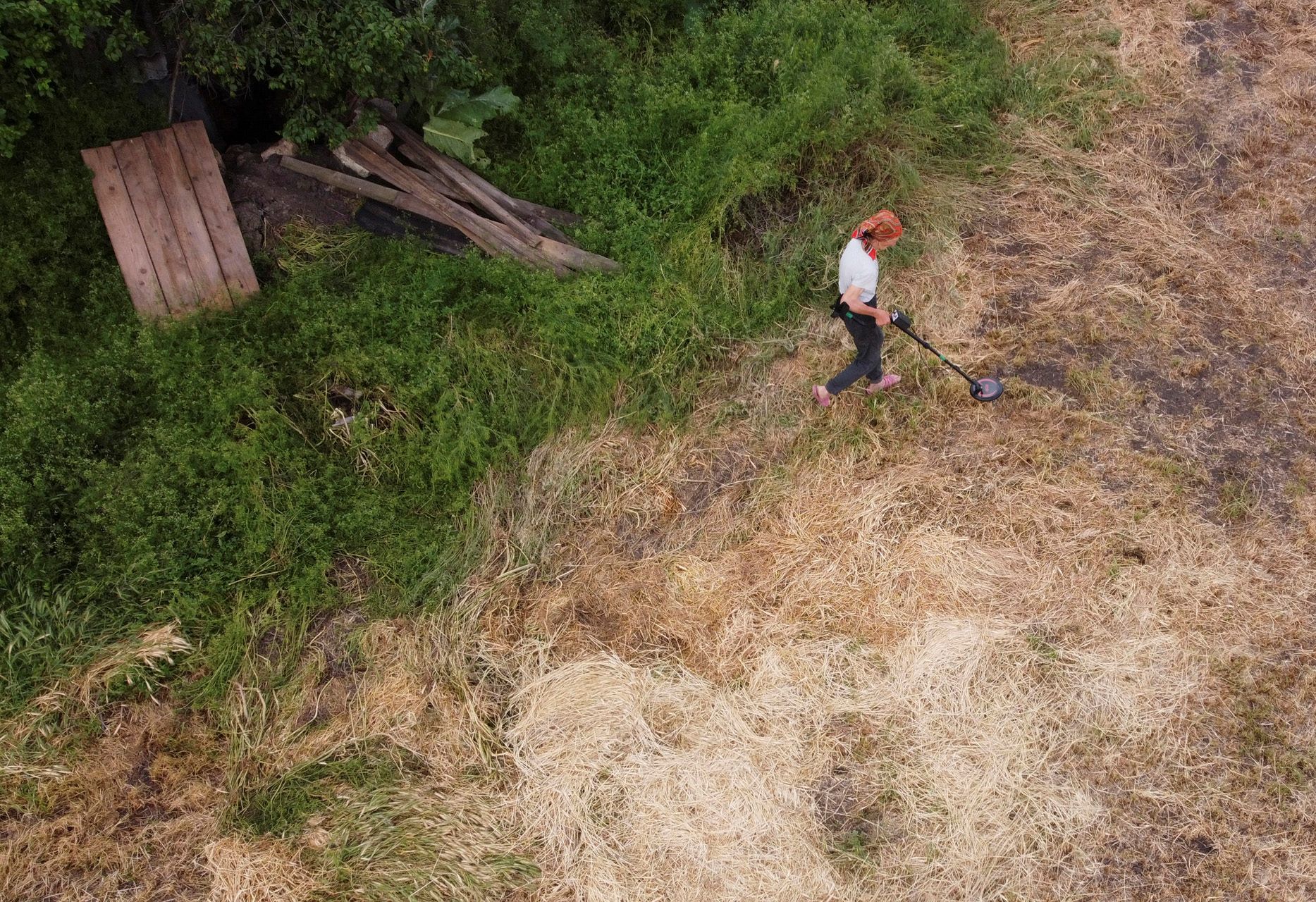 Viktoriia Lakezina / Reuters / Scanpix / LETA Жительница села Степовая Долина Ханна Плишчинская на границе Херсонской и Николаевской областей обходит участок у своего дома с металлоискателем. Село много месяцев находилось прямо на линии фронта и подвергалось обстрелам. Ханна, вернувшаяся после ухода российских войск домой из эвакуации, ищет неразорвавшиеся боеприпасы