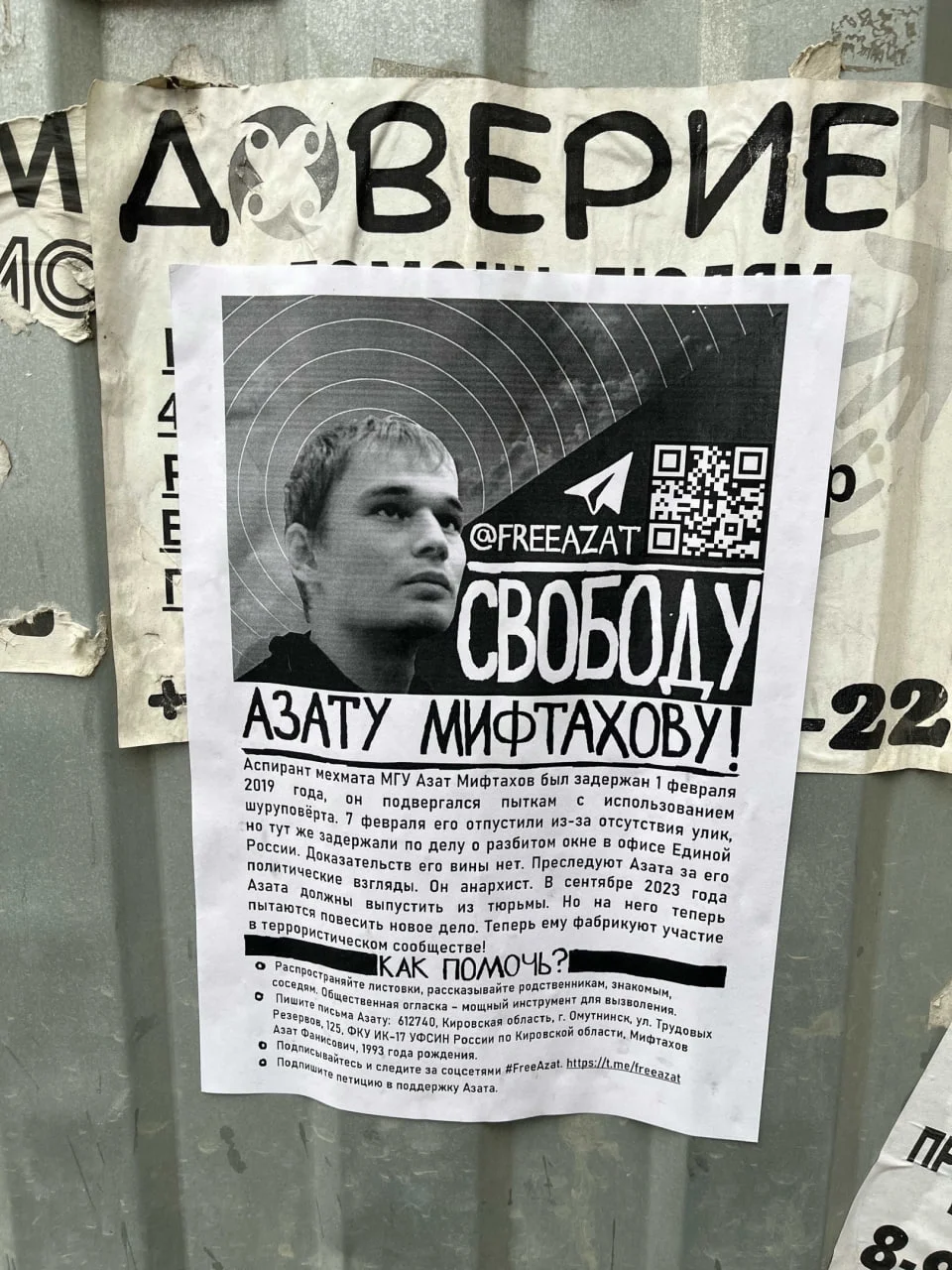 18-го января 2021-го года Азата Мифтахова приговорили к 6 годам колонии по обвинению в «хулиганстве». Следствие на основании показаний засекреченных свидетелей утверждает, что математик напал на офис партии «Единая Россия», разбил окно и бросил туда дымовую шашку. Недавно жена Мифтахова Елена Горбань рассказала, что ФСБ передала заключенным его интимные фотографии. Из-за своей бисексуальности Мифтахов оказался в касте «обиженных».