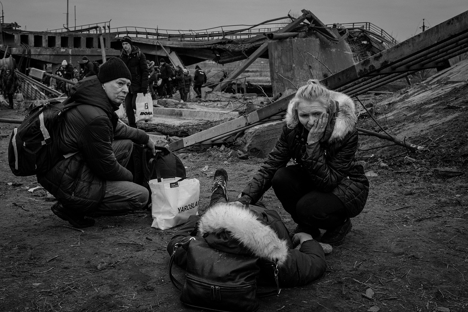 Женщина плачет над родственником, вместе с которым они пытаются покинуть Ирпень, 7 марта 2022 года. Фото: Nicole Tung