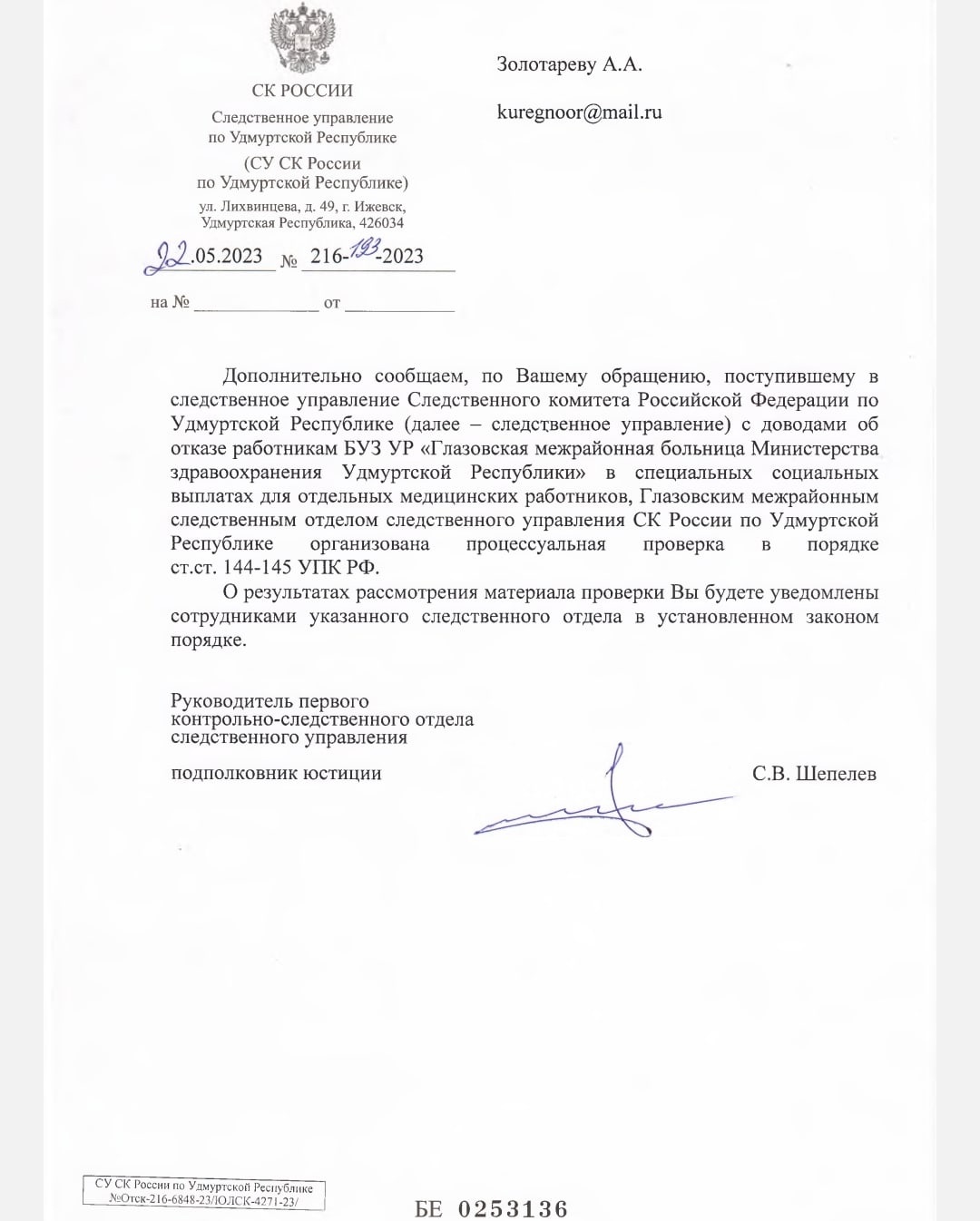 Следственным управлением по Глазову начата проверка по отказу в выплатах медработникам